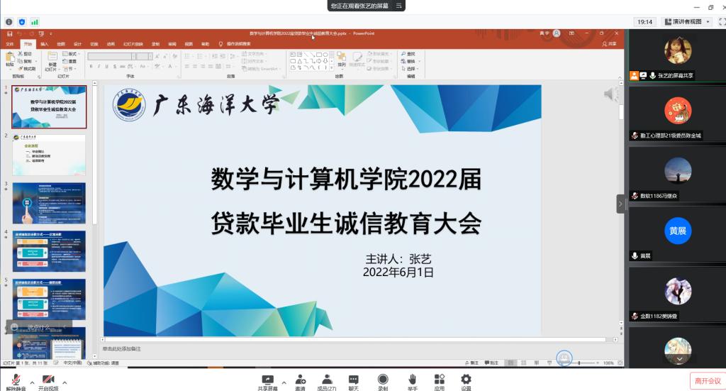 为帮助2022届贷款毕业生掌握还款流程和政策,加强贷款毕业生诚信教育,6月1日晚,黑料网 通过腾讯会议平台召开2022届贷款毕业生诚信教育会议。会议由黑料网 负责贷款专项工作的辅导员张艺老师主讲,黑料网 2022级贷款的全体毕业生参加。