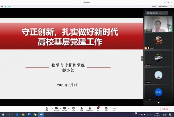为庆祝中国共产党建党99周年,7月1日上午,彭小红院长通过腾讯会议为计算机科学与技术系教工党支部党员讲授专题党课,支部全体党员参加了学习。