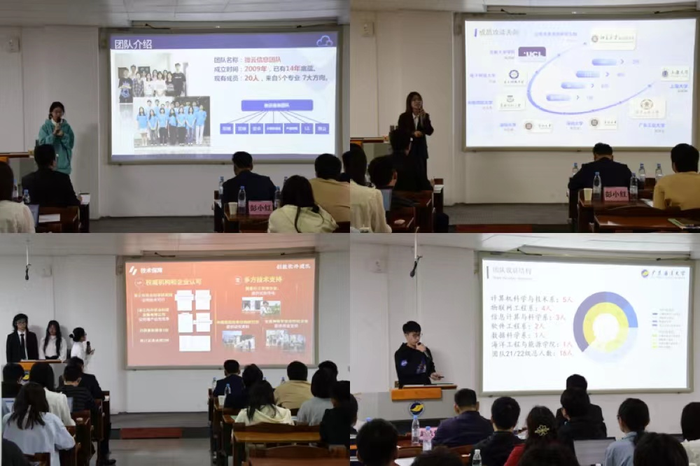 创新创业实践基地的十一支优秀科技团队进行了总结汇报。各团队分别从科技竞赛获奖、学术科研、产品开发及技术创业等四个方面进行了总结汇报,内容涉及了物联网应用、数据挖掘、自动控制、人工智能等技术。这些成果在海洋领域、农渔业、工厂自动化及民用消费等方面得到了相关应用。现场嘉宾们对各团队的汇报提出了建议和指导并进行了打分。汇报团队的精彩演讲不时获得现场观众的阵阵掌声,各创业团队呈现的最新科技作品让现场嘉宾和同学们啧啧称赞。汇报结束后,现场的嘉宾领导对各团队的创新创业成果给予了高度评价。