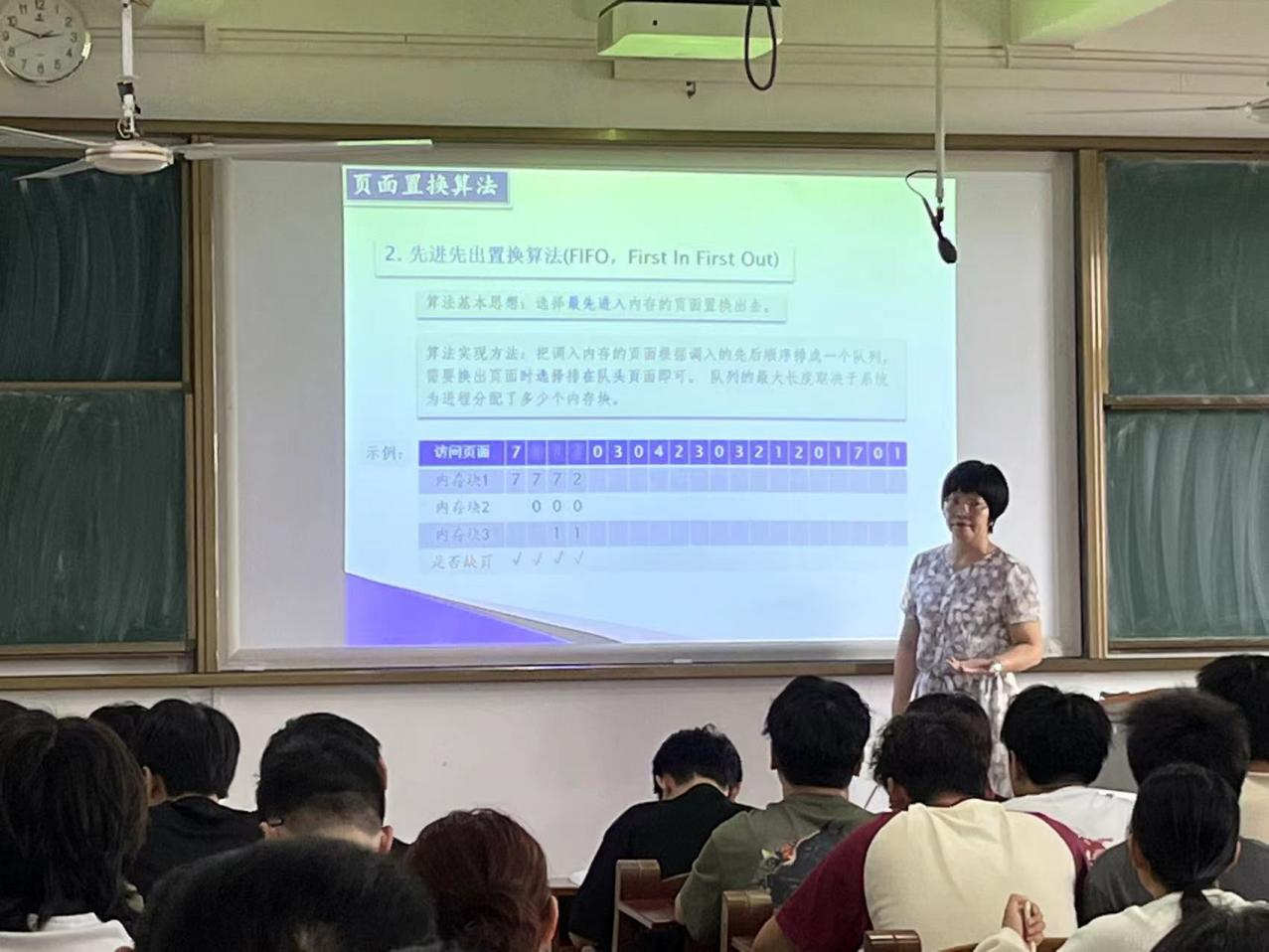5月9日下午,郑赞红老师讲授了《操作系统》课程。她首先回顾了虚拟存储技术知识,重点讲解了先进先出置换算法等内容。陈入云副院长主持观摩会,他指出郑老师的课程教学思路清晰,讲练结合,师生互动氛围活跃,取得了理想的教学效果。