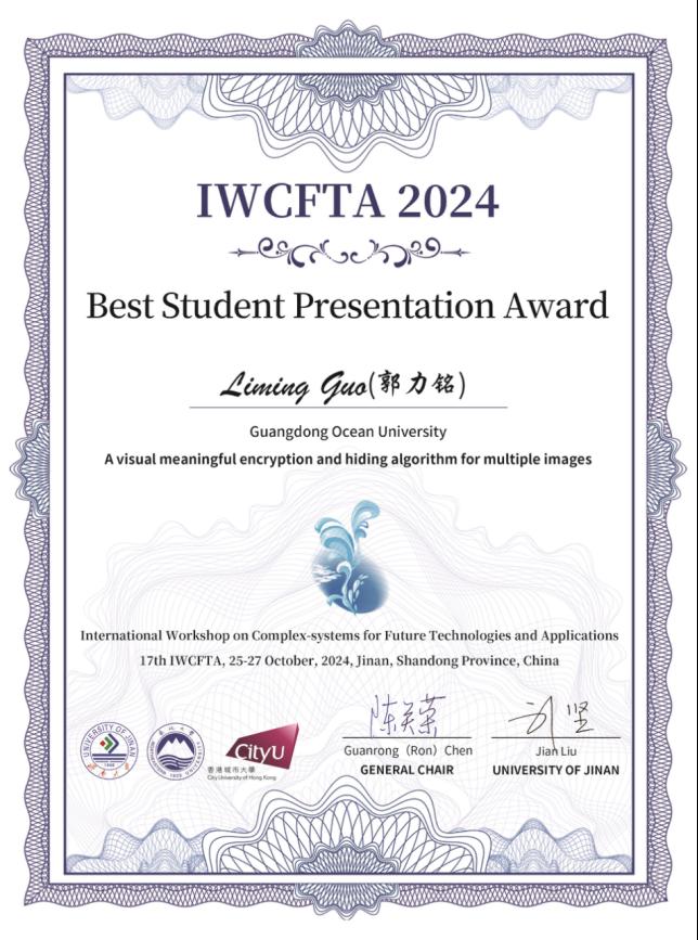 、香港城市大学、东北大学、哈尔滨工业大学、中南大学、湖南大学、济南大学、广东海洋大学等国内外82所高校和科研单位300多位专家学者参会,现场报告的学术论文共115篇。由于表达能力较强和语言表述较清晰,经会议推荐,郭力铭同学的报告被评为IWCFTA2024“最佳学生报告奖”,其指导教师为叶国栋教授。