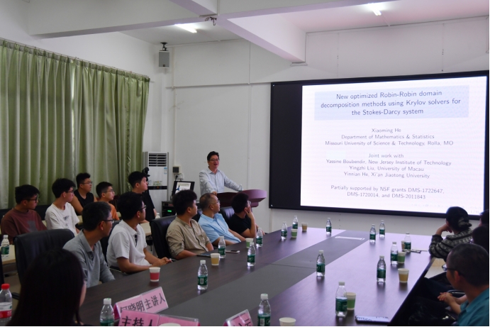 报告会上,何晓明教授围绕Stokes-Darcy系统模型展开深入讲解,系统阐述了该模型的核心原理、数学形式及在相关领域的实际应用。随后,他梳理了当前该系统的主流求解方法,重点介绍了区域分解方法的研究现状,并详细拆解了自主研发的新型优化Robin-Robin区域分解方法的设计思路、实现路径,以及将其应用于Stokes-Darcy系统求解的关键步骤。最后,何晓明教授结合具体数值案例,通过数据对比与结果分析,直观展示了该新型方法在求解效率、精度上的显著优势,充分验证了方法的有效性与实用性。