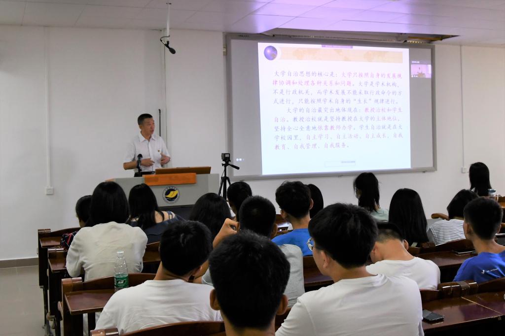 党委书记谢仕义教授以“大学是什么”为主题与新生共同探讨大学的理念、精神、文化和功能的内涵与外延。他以深刻又富有哲理性的语言阐述了崇尚学术、追求卓越、与时俱进才是大学之道;同时他也引导新生要树立崇高的理想信念,具备强烈的社会责任意识,努力学习,方能成就自我、服务社会。