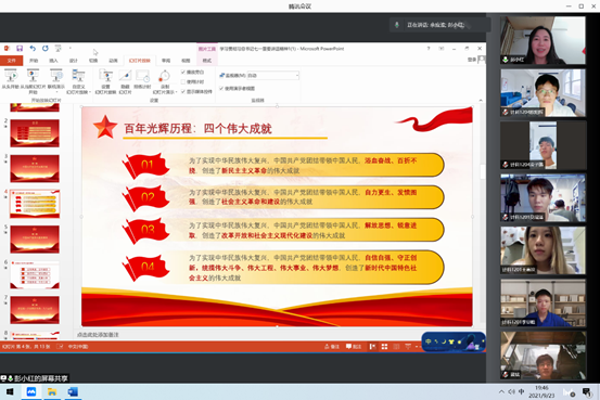 彭小红院长围绕习近平总书记在庆祝中国共产党成立100周年大会上的讲话,带领师生一起回顾了中国共产党百年辉煌历程,深刻领悟了中国共产党带领中国人民创造新民主主义革命、社会主义革命和建设、改革开放和社会主义现代化建设以及中国特色社会主义新时代四个时期伟大成就,逐一阐释了伟大的建党精神,鼓励师生要学深悟透,努力践行。她在课程最后强调,百年来,中国共产党奋斗的光辉历程和为国家、为民族做出的伟大贡献,都值得师生党员和青年学生认真学习和领会运用,要真正做到学史明理、学史增信、学史崇德、学史力行。