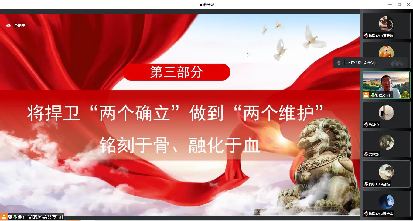 党委书记谢仕义通过腾讯会议给物联1203、1204班的同学们讲授了题为“领悟两个确立,做到两个维护”的新学期“思政第一课”,带领同学们一同深入学习了《习近平谈治国理政》第四卷。