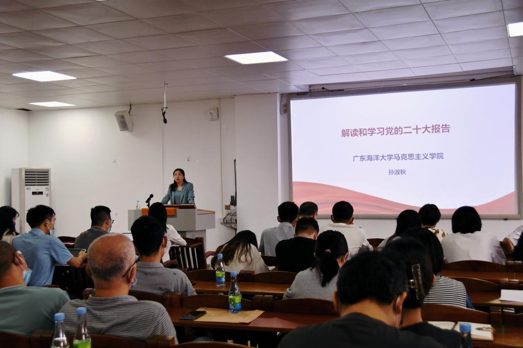 孙淑秋围绕党的二十大的重大意义、党的二十大的主题、过去5年工作和新时代10年伟大变革的重大意义、习近平新时代中国特色社会主义思想的世界观和方法论、以中国式现代化全面推进中华民族伟大复兴的使命任务、对未来5年党和国家各项事业发展的战略部署、以党的伟大自我革命引领伟大社会革命的重要要求和发扬斗争精神、增强斗争本领、必须牢牢把握团结奋斗的时代要求等八个方面,对党的二十大报告进行了系统阐述和深入讲解。报告主题鲜明、内容详尽、深入浅出,让在场的师生受益匪浅。