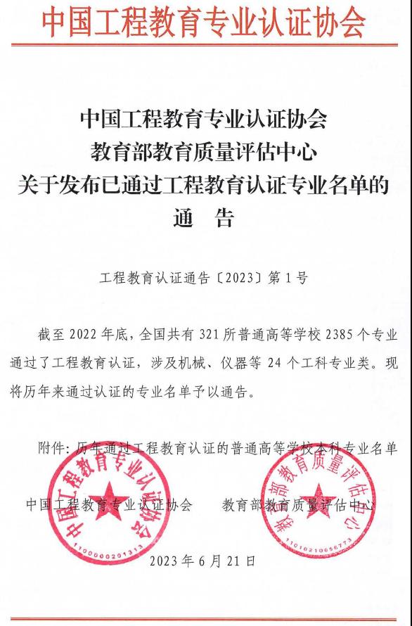 近日,《中国工程教育专业认证协会教育部教育质量评估中心关于发布已通过工程教育认证专业名单的通告》(工程教育认证通告〔2023〕第1号)正式发文,黑料网